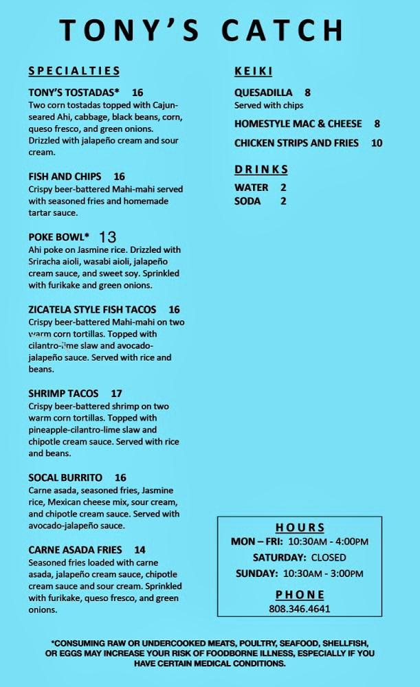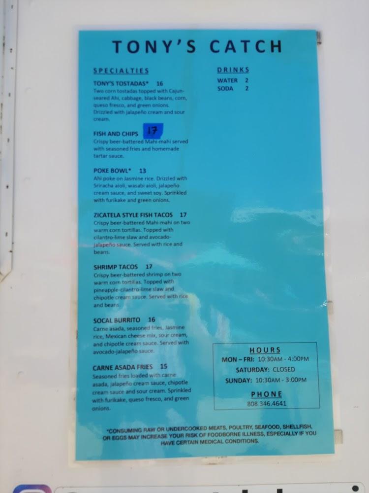 The menu at Tony's Catch focuses on seafood delights. Signature dishes include their famous fish and chips, prepared with local fish for top-notch flavor. The poke bowl is another standout, brimming with fresh ingredients and bright colors. Tacos offer choices between fish and shrimp, styled to showcase Hawaiian influences. Smaller portions cater to kids, like cheesy quesadillas and chicken strips. Drinks include refreshing soda options, making dining here versatile. Each dish embodies simplicity and tradition, highlighting local culinary practices.