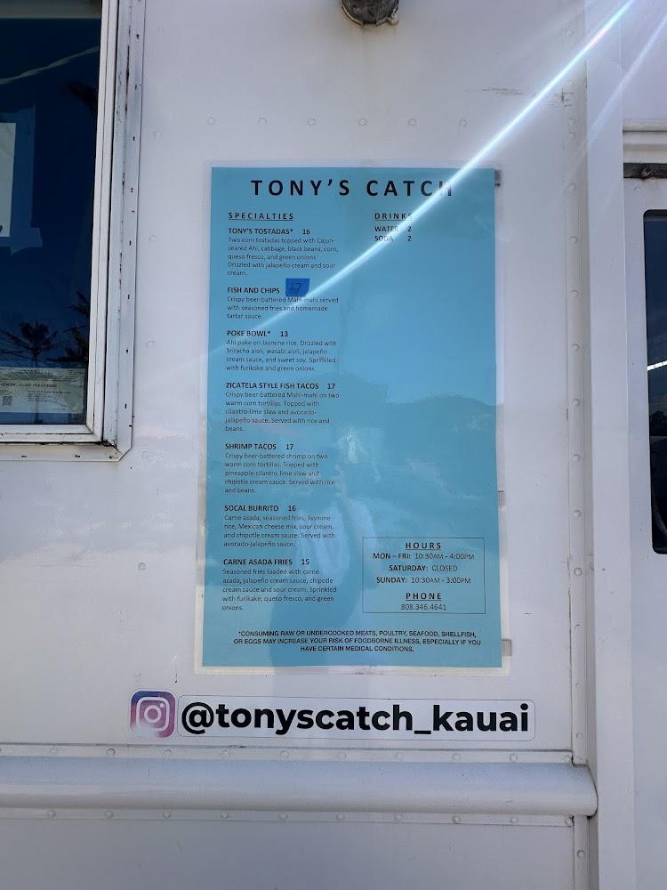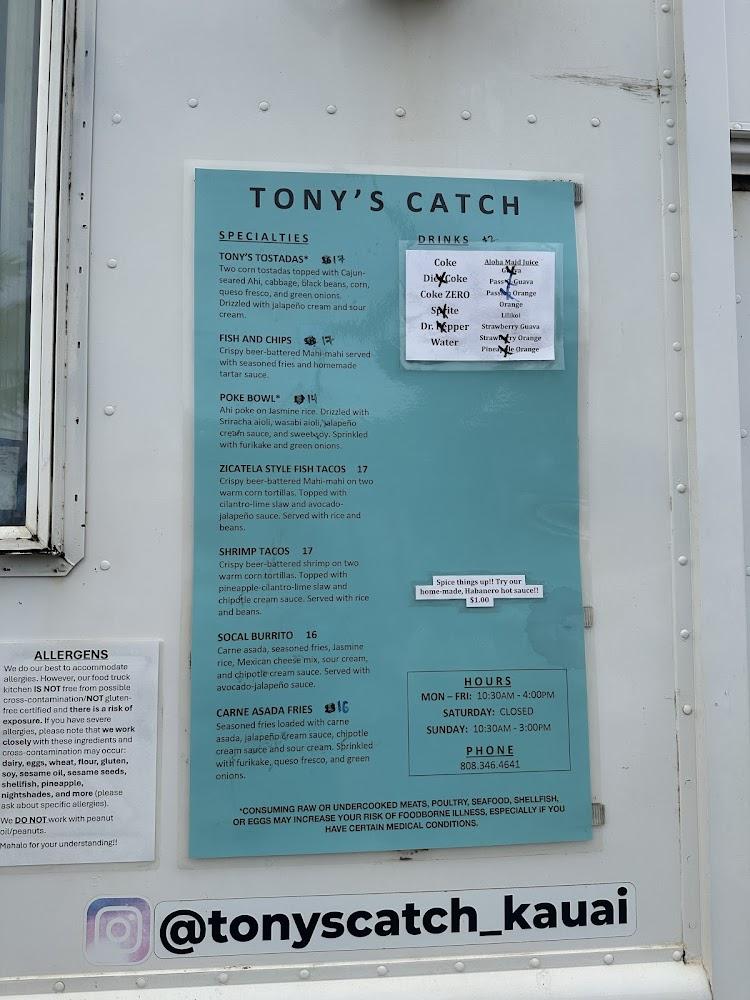 Welcome to Tony's Catch, your go-to food truck in Kapa’a, HI, where delicious meets convenience! Our menu features mouthwatering fish & chips, vibrant poke bowls, tasty tacos, and kid-friendly options, perfect for a casual lunch or dinner. Enjoy a relaxed atmosphere on our terrace or opt for takeout and delivery. With wheelchair accessibility, free parking, and a commitment to local specialties, we welcome groups and tourists alike. Join us for a delightful dining experience with craft beers and traditional dishes, all served with a smile. Come taste the best of the islands at Tony's Catch!